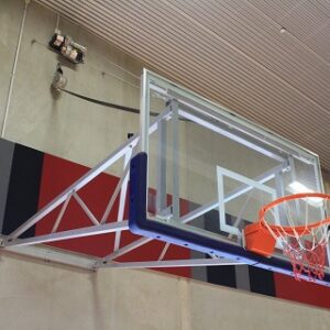 Uplifting Backboards feature an International size glass backboard manufactured to FIBA regulations, mounted on a full steel frame. The backboard frame is supported by arms extending from a wall fixed support frame.